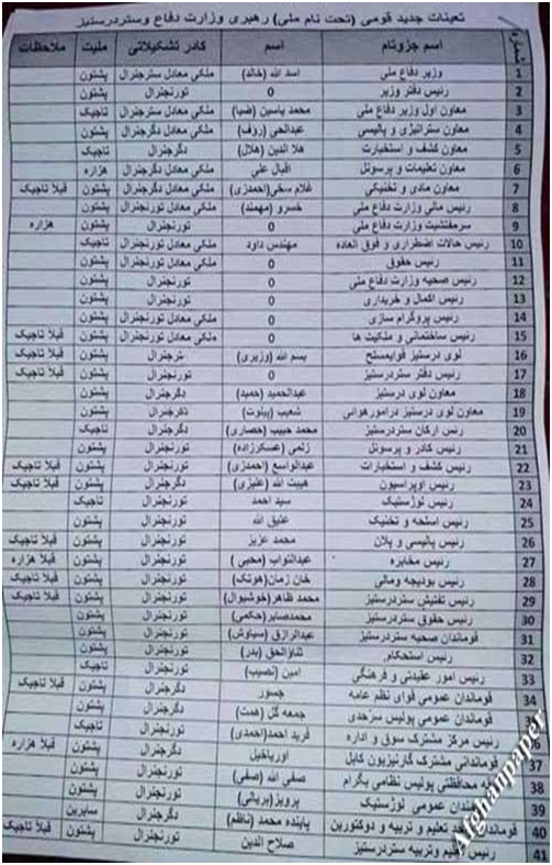 * - این تعیینات فقط دو ماه قبل از سپردن قدرت به طالب، دستخوش تغییراتی گردید که آنهم در شرایطی که اکثر ولایات به طالب سپرده شده بود، چیزی بیشتر از جا به جائی چند خاین، معنا و ارزش بیشتری نداشت. ع. م.