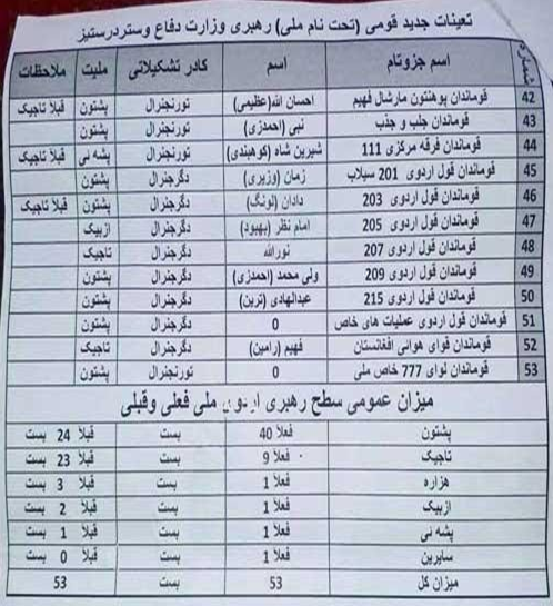 همان طوری که قبلاً تذکار دادم خلیلزاد در بهترین صورت شاید نقش محور را در جمع هیأت همراهش داشته بوده باشد، مگر نقش تعیین کننده همان بود که از جانب کاخ سفید، وزارت خارجه و وزارت دفاع امریکا به کارمندان شان دیکته می شد. آنها برای این که بتوانند حاکمیت را بدون مشکل به طالب انتقال دهند، گذشته از ایجاد نفاق قومی و زبانی و مذهبی بین طبقۀ حاکم اقوام مختلف به وسیلۀ وزارت خارجه و "سیا" و باند "غنی احمدزی" را از نفوذ بقیه اقوام مانند تاجیک، هزاره، ازبیک و ... هراسان ساختن، از طریق قومندان عمومی نیروهای اشغالگر "مولر" گذشته از زمینه چینی جهت ترور مخالفان صاحب رسوخ طالب، تمام قومندان های نظامی و مراکز اصلی قدرت نظامی را به کسانی سپردند که به یک اشارۀ آنها، پایگاه ها و مراکز فرماندهی شان را با تمام سربازان و افسران تسلیم طالب نمودند. به صورت نمونه می توانید به جدول آخرین تعیینات این واحد های ارتشی نظر بیفکنید.